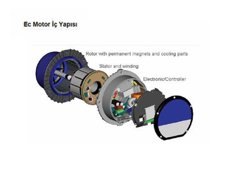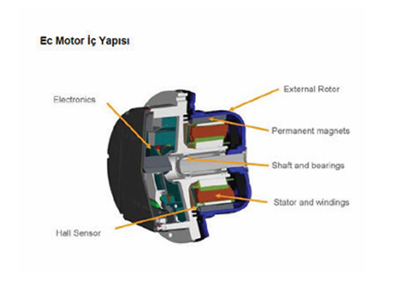 EC fanlarda kullanılan motorların verimliliği yüksek, elektronik komutlu ve kalıcı mıknatıslıdır.Bunların devir sayısı,entegre kontrol birimi üzerinden ayarlanıyor. Cihazlar, EN 61800-2’deki genel gereksinimlere göre devir sayıları değiştirilebilen elektrik tahrikleri için yapılmış ve tek kadran işletimine sahiptir. Güç elektroniğine sahip cihazların dayanıklılık ömrü önemli derecede çevre sıcaklığına bağlıdır. Elektronik yapı parçaları ne kadar uzun süre yüksek çevre sıcaklıklarında kalıyorsa, o kadar çabuk eskirler ve arıza ihtimali de artar. EC Fanlar, ek motor korumasına gerek duyulmadan %100 sürekliliği ve güvenilirliği garanti edecek şekilde entegre korumaya sahiptir.