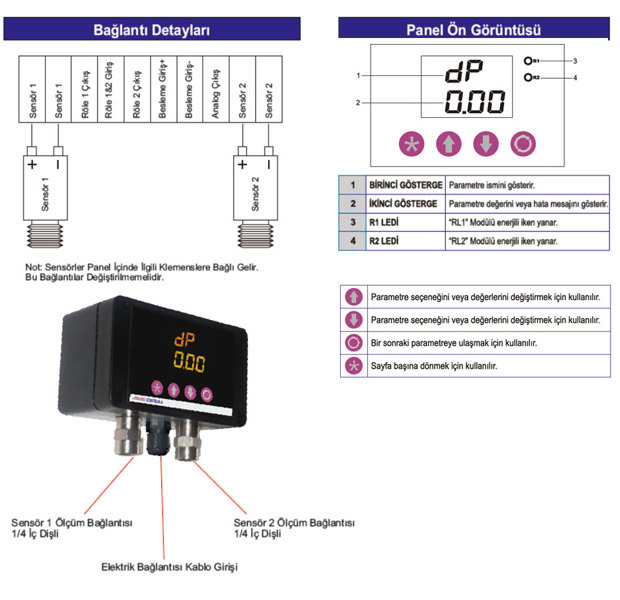 Fark Basınç Transmitteri ve Kontrol Paneli (DPT-CP) ; mekanik sistemlerde (hava,su,yağ,yakıt ) hat basıncını ölçmek ve fark basıncı hesaplamak üzere dizayn edilmiştir.Korozif gazlar ve kimyasallardan korunmalıdır. Cihaz sahip olduğu 2 adet yüksek hassasiyetli basınç sensörü ile çalışır.Her iki sensörde yapılan ölçümler ayrı ayrı değerlendirilebileceği gibi matematiksel işlem ile fark basınç değeri vermesi de mümkündür. Kolay kullanımı ile müşteri memnuniyeti hedeflenmiştir.