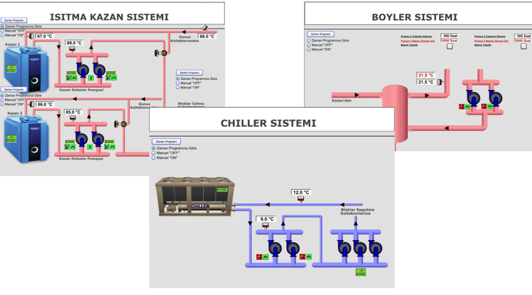 Binadaki Fancoil, Radyator, Klima Santralleri , Sicak su Tanklari dahil butun kontroller merkezi bir bina otomasyonu sisteminden yapildigi icin, binanin gercek isitma ve sogutma yuku hesaplanir , bu degerlere gore Chiller ve kazanlara set deger kompanzasyonu yapilarak , Chiller ve kazanlarin fazla sogutma veya isitma enerjisi uretmeleri engellenmis olur. Binadaki pompalar ve fanlar , yapilacak basinc , fark basinc , debi gibi olcumlere dayanarak Frekans konvertoru ile kontrol edilerek, fazla enerji tuketimi engellenmis olur
